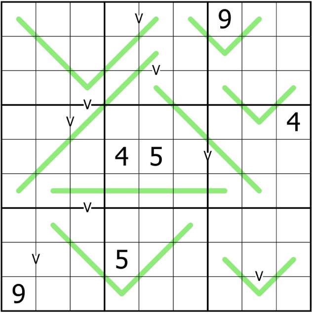 German Whispers: Numbers on green lines must be at least 5 apart from their neighbours on the line. Numbers may repeat on the line if other rules allow.