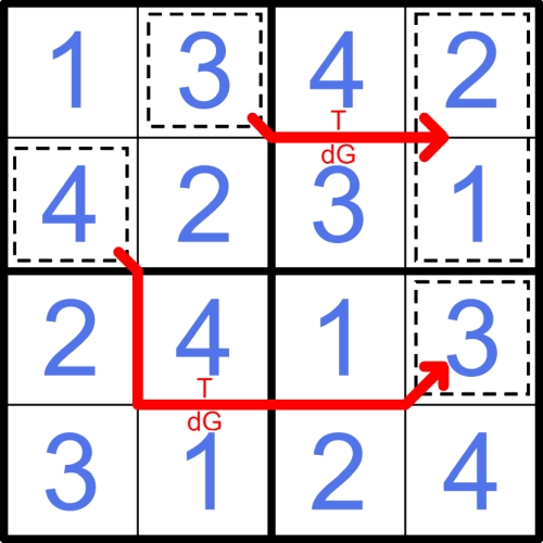 Beispiel: Das folgende Bild zeigt ein vollständig gelöstes Beispiel auf einem 4x4-Gitter. Man kann das Beispiel selbst hier auf SudokuPad lösen.