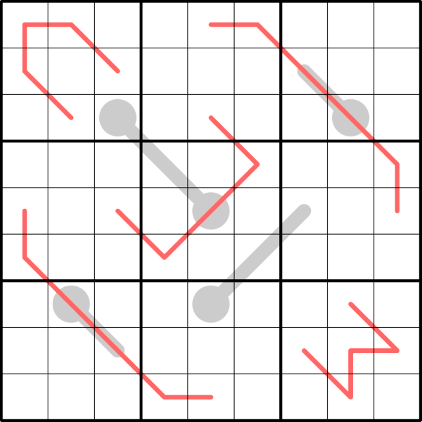 Triple-Headed Beast: Das Raster enthält 18 Triple-Headed-Beast-Zellen, die in zwei separate Gruppen zu je neun Zellen unterteilt sind. Zellen aus derselben Gruppe dürfen sich in einer Zeile, Spalte oder markierten 3x3-Box nicht wiederholen, und beide Gruppen müssen jeweils einmal die Ziffern 1 bis 9 enthalten. Innerhalb einer markierten 3x3-Box dürfen die beiden Triple-Headed-Beast-Zellen (eine aus jeder Gruppe) nicht in derselben Zeile oder Spalte erscheinen.