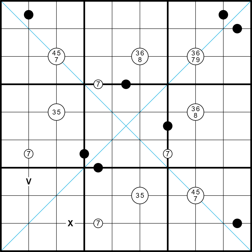 X/V: Digits in cells joined by an X sum to 10. Digits in cells joined by a V sum to 5. Not all Xs and Vs are given.