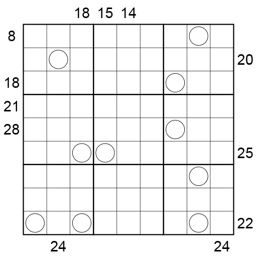- Ein Hinweis außerhalb von Reihe oder Spalte N gibt die Summe aller Ziffern an bis zu der Zelle, welche die Ziffer N enthält. (Die Ziffer N selbst ist nicht Teil der Summe.)