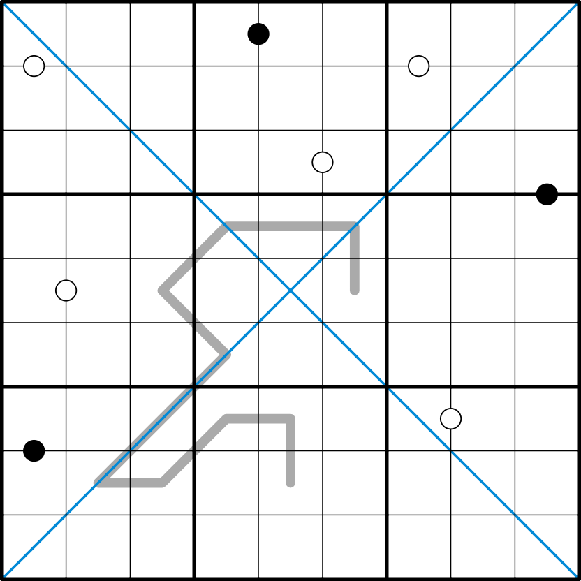 Kropki: A white dot joins two consecutive digits and a black dot joins digits in a 1:2 ratio. Not all dots are not necessarily given.