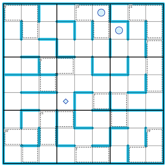 The path will be a palindrome line that visits each box at least once, starting in either circle and ending in the other circle. The middle of the palindrome line is marked with a diamond.