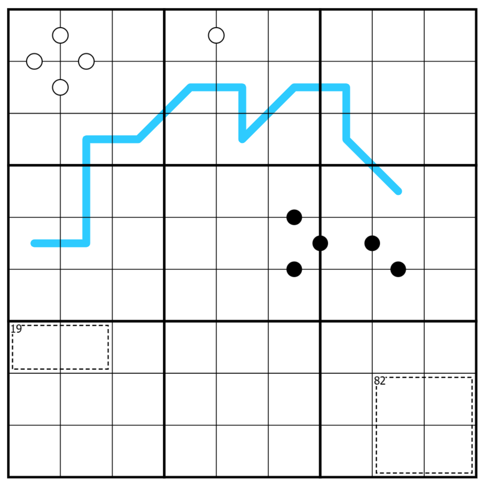 Kropki Dots: Cells separated by a black dot contain values where one value is double the other. Cells separated by a white dot contain consecutive values. Not all dots are given.