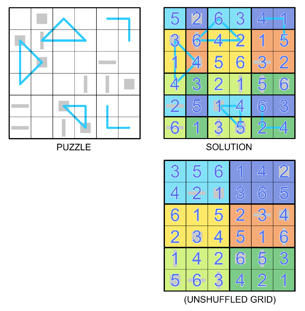 The grid has been shuffled: the rows and columns have been reordered (so boxes may now consist of multiple disconnected pieces).