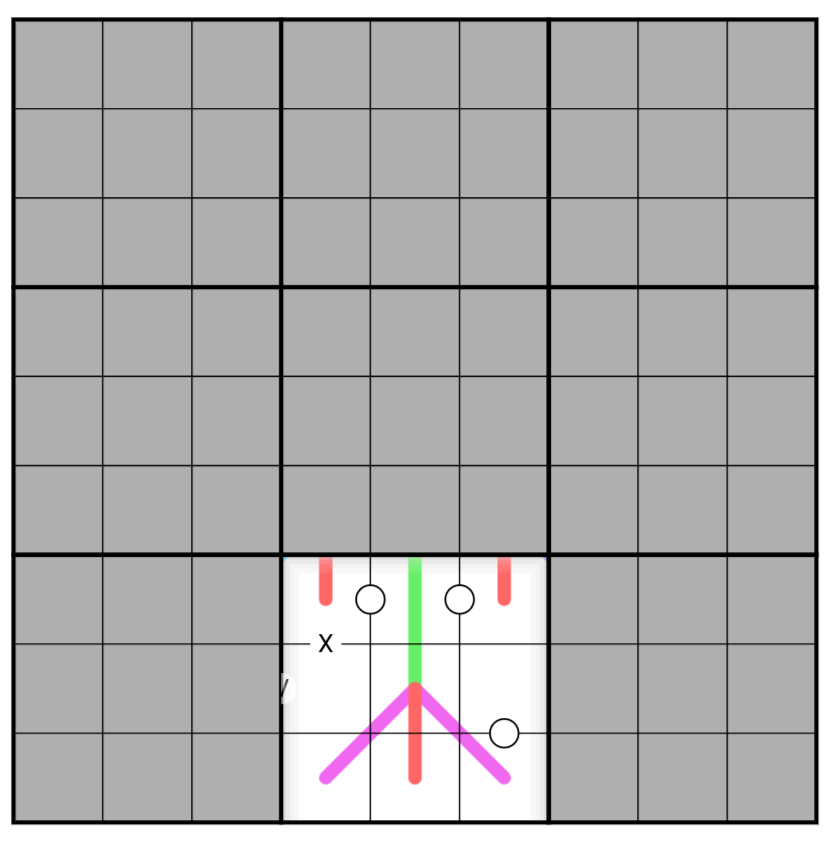 • Digits along a light blue line create a sumline where the sum of digits on a line within a particular 3x3 box must be the same for all the boxes the line passes through.