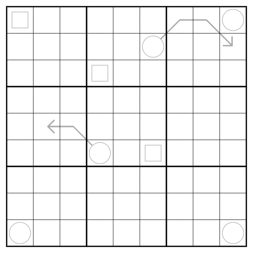 - Station cells: Mark some cells as station cells in the grid, one in every row, column and box. In addition, no two station cells may be in the same relative box position, and each station cell contains a unique digit. Rectangle cells are station cells.