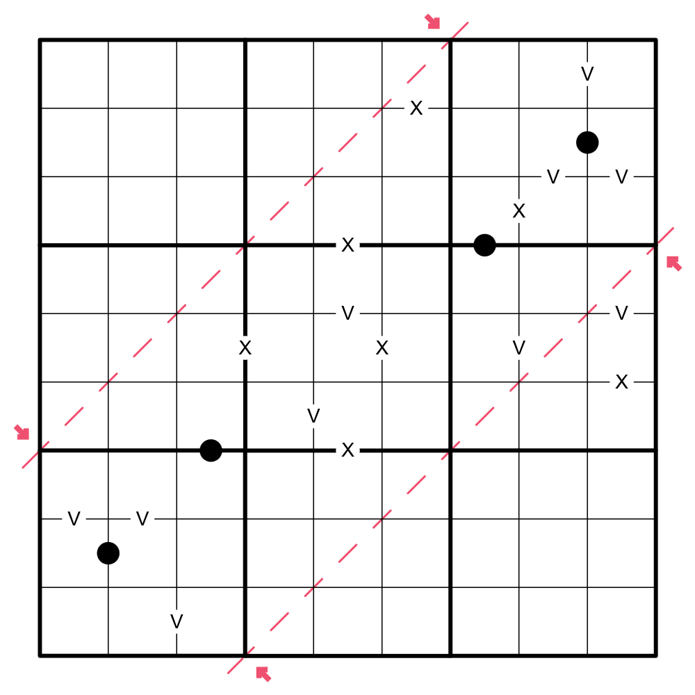 • Cells joined by a V or X have digits that sum to 5 or 10 respectively.