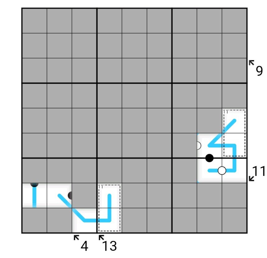 Normal sudoku rules apply Black dots separate cells with a ratio of 1:2 White dots separate consecutive numbers Not all black and white dots are shown. Lines sum to the same amount on either side of the 3x3 box region they pass into. Numbers on diagonals sum to the numbers shown outside the grid. Numbers in cages sum to the number in the top corner of the cage.