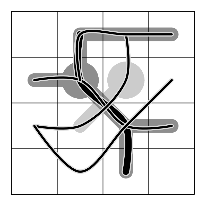All black lines are 4 cells long and pass through the center of all affected cells. One line is thicker to make it easier to distinguish.