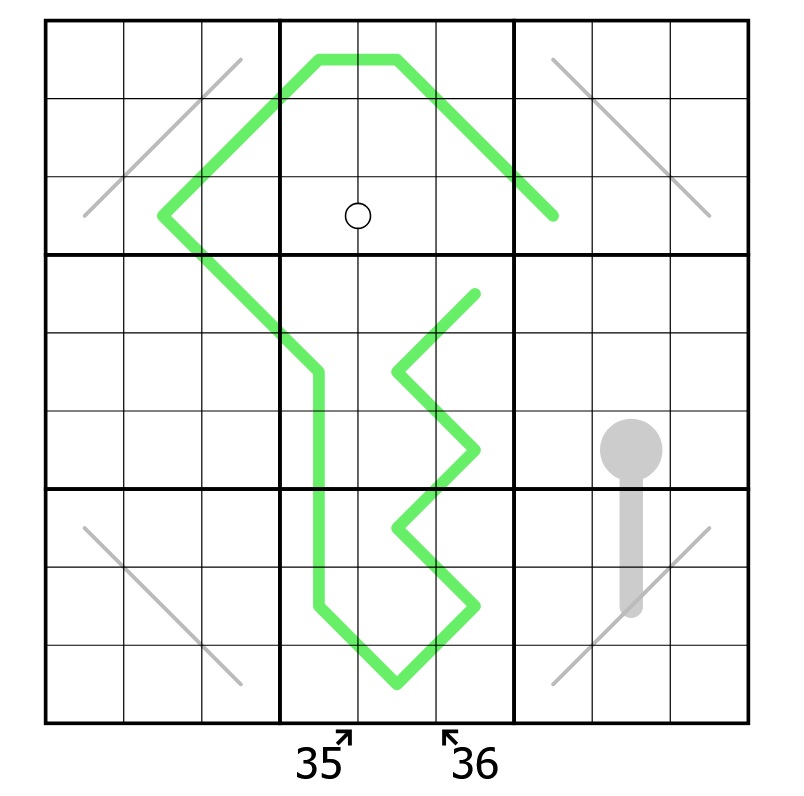 Es sind unten zwei Diagonalen mit Nummern markiert - Nummern auf diesen Diagonalen müssen zu der gegebenen Nummer addieren.