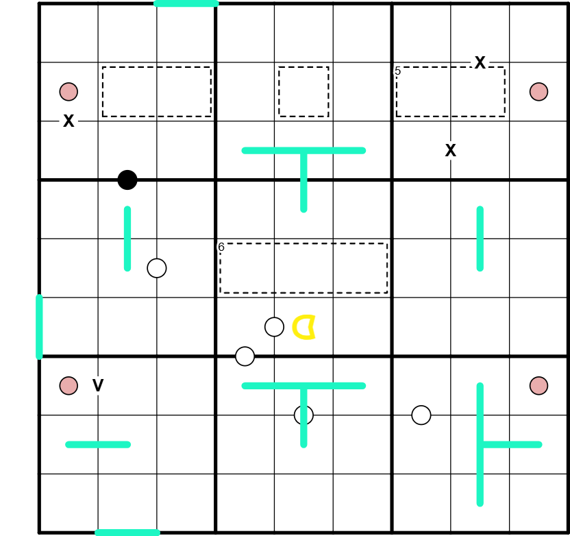 Get Pacman (R6C5) to eat all four Power Pellets (pink circles) by following a path of orthogonally connected cells. The path may leave the grid and enter on the opposite end (like the Pacman video game). Pacman's path must consist of only prime numbers (2,3,5,7). The path may not intersect a green line or enter a killer cage.
