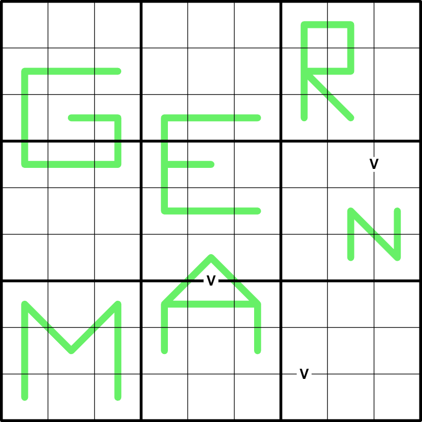 German whisper: Neighbouring/adjacent digits along a green line have a difference of at least 5.