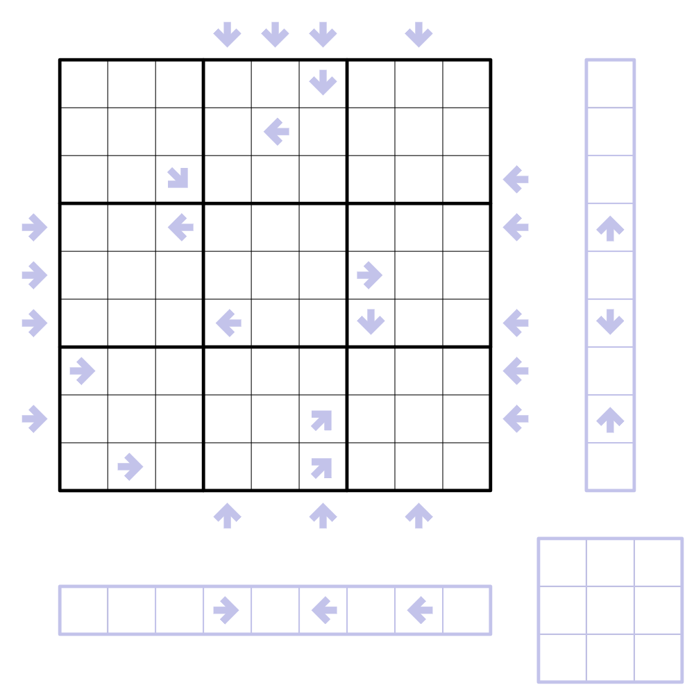 - Fill the cells outside the 9x9 grid with the digit missing from the corresponding row, column or box.