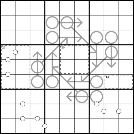 ARROWS- Numbers on arrows sum to the number in the arrow's circle. Numbers may repeat on arrows, if other rules allow. All arrows are straight, and length 2.