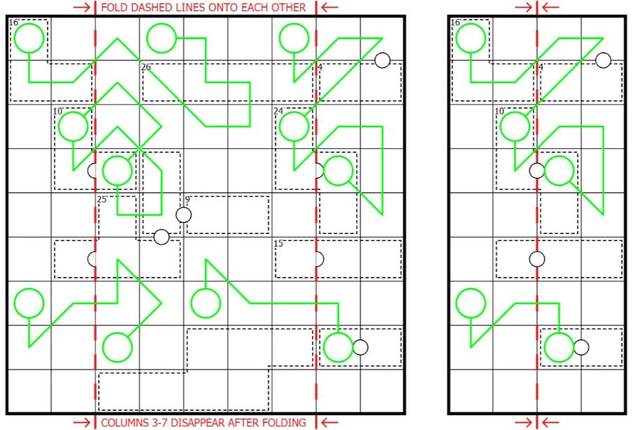 • If there is a border in the folded grid on the red dashed lines, there must be a border in the corresponding positions of the unfolded grid, and vice versa.
