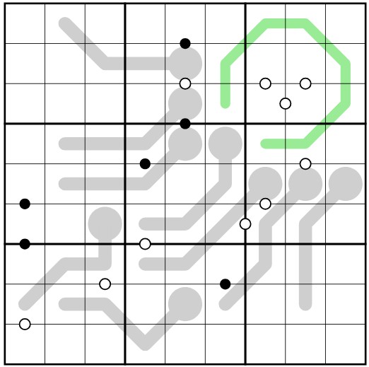 Kropki: Felder, die mit einem schwarzen Punkt verbunden sind, haben ein Verhältnis von 1:2. Felder, die mit einem weißen Punkt verbunden sind, haben eine Differenz von 1. Nicht alle möglichen Punkte sind gegeben.