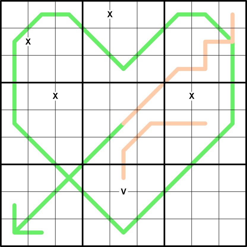 X/V: Digits in cells joined by an X sum to 10. Digits in cells joined by a V sum to 5. Not all Xs and Vs are given.