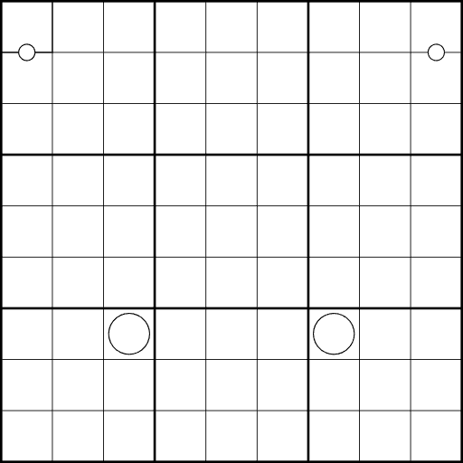 Schlange: Zeichnen Sie eine Schlange in das Raster. Die Schlange ist eine einzige, unverzweigte Linie, die in einem der 3×3-Felder beginnt und jedes Feld genau einmal durchläuft, bevor sie im letzten Feld endet. Die genaue Reihenfolge, in der die Schlange diese Felder durchläuft, wird vom Löser bestimmt. Die Schlange bewegt sich nur orthogonal (links, rechts, oben, unten) und kann ein einzelnes Feld nicht mehrmals durchlaufen.