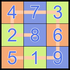 Entropic: Any sequence of 3 adjacent digits along a peach line must have a low digit (123), a medium digit (456) and a high digit (789).