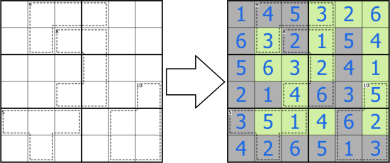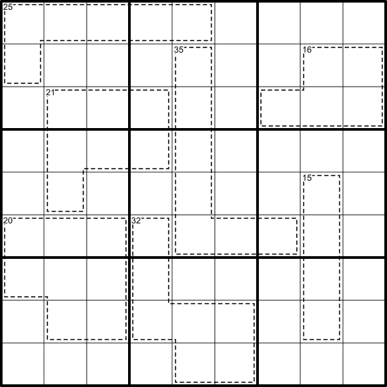 Sum-Product Cages: The number in the upper left corner of a dotted cage gives the sum of all shaded cells in the cage. It also gives the product of all unshaded cells in the cage. Digits may repeat in cages if allowed by other rules.