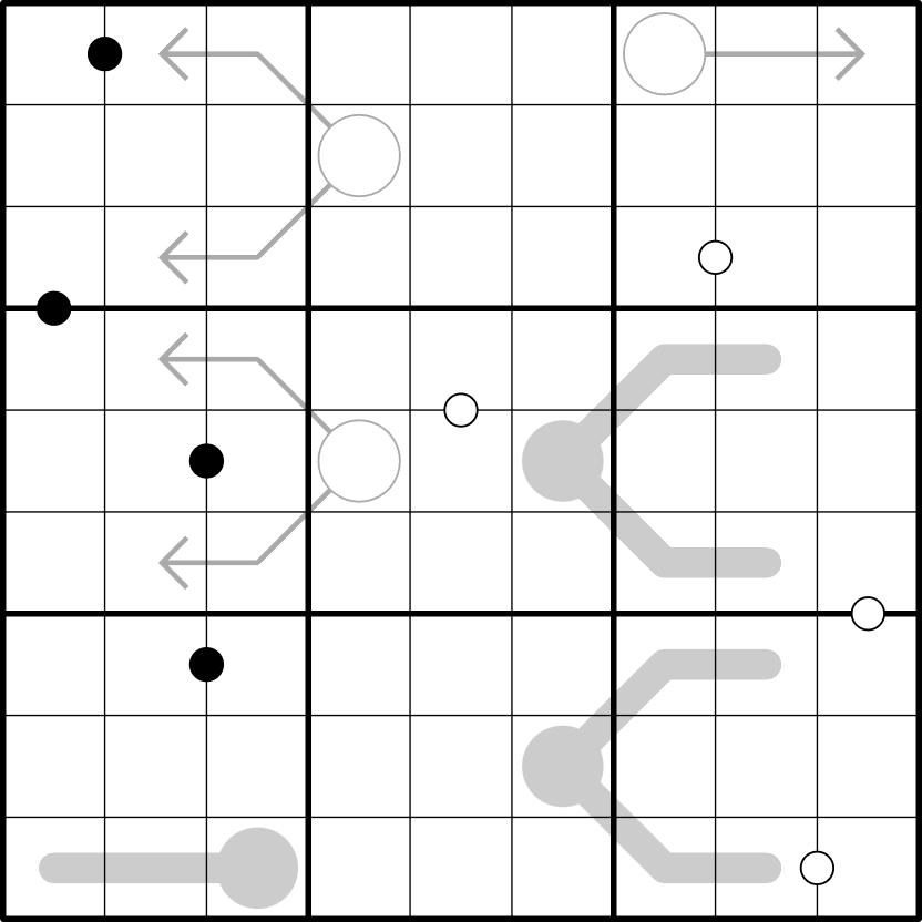 - Kropki pairs: On a black dot one digit is double the other. On a white dot digits differ by 1.