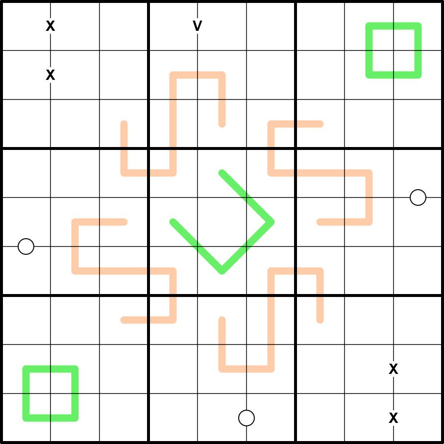Entropic Lines: Every set of three consecutive cells on a peach entropic line contains a low (123), middle (456), and high (789) digit.