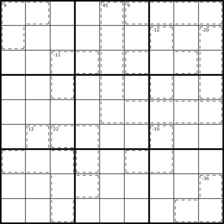 - Within each row, digits to the right side of a 9 are counted negatively towards cage totals.