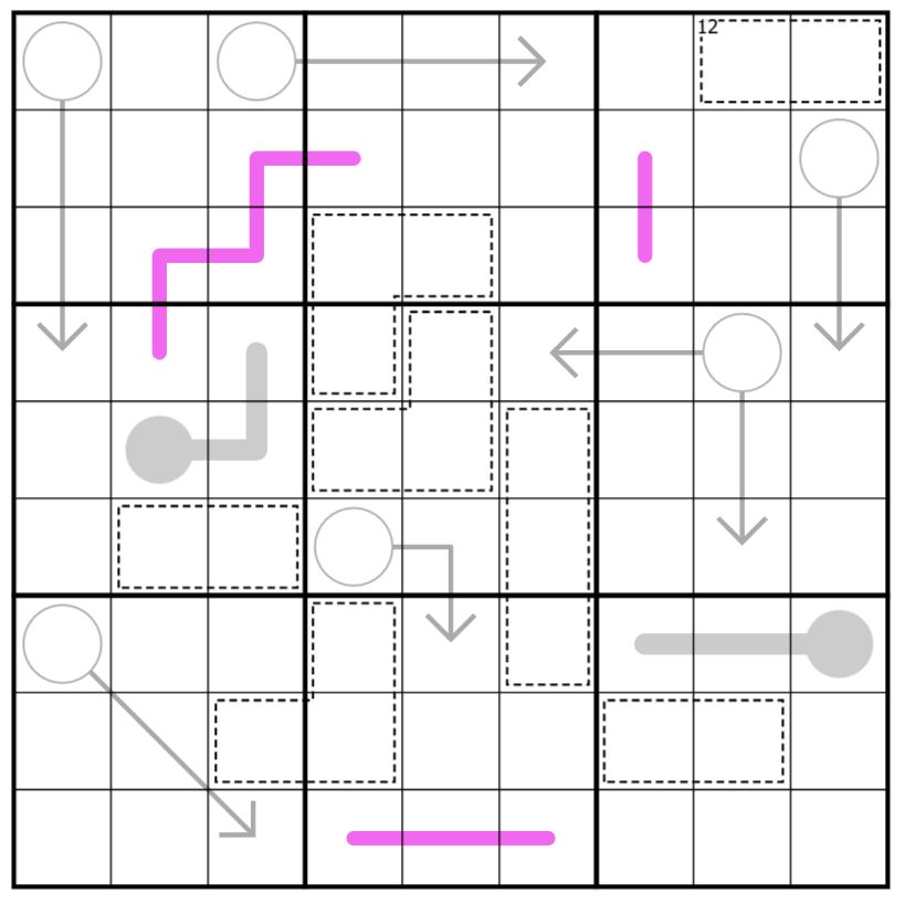 Each of the clue types listed above is called an "expanse" (note: for the arrow circle with two arrows, all 5 of those cells count as a single expanse). Each cell, or group of orthogonally connected cells, which contains no clues is called a "void". An edge between an expanse cell and a void cell is called a "boundary". To maintain balance, each void must share a sum with at least one of the expanses with which it shares a boundary. Multiple voids may share their sum with the same expanse, and a void may share its sum with multiple expanses.