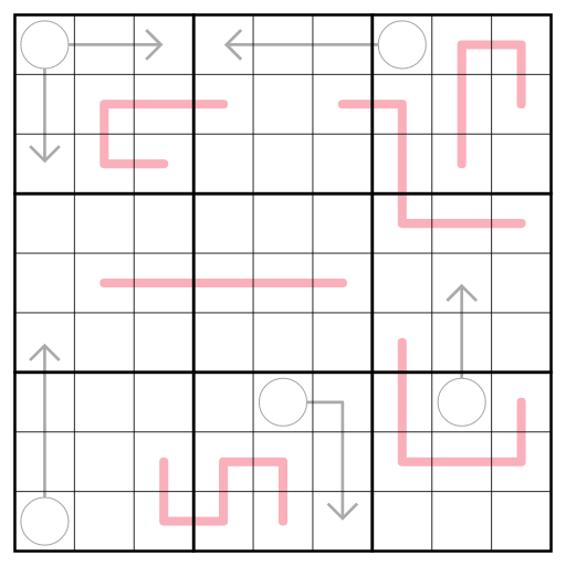 - Normal sudoku rules apply, i.e. each row, column, and 3x3 region has to contain the digits from 1 to 9 once each.