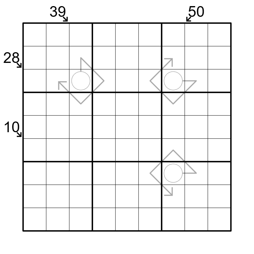 Rules: Each row, column, and 3x3 box contains the digits 1 through 9. Digits on an arrow sum to the value in the attached circle. Clues outside the grid give the sum of all digits along the indicated diagonal.