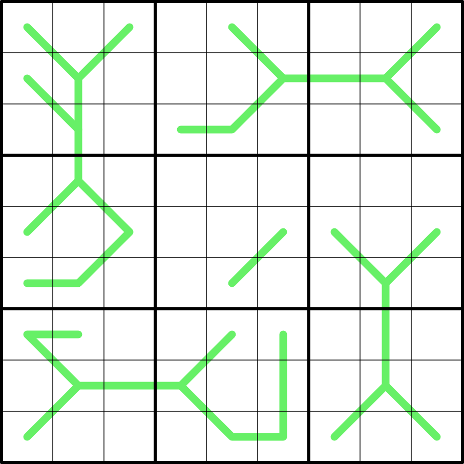 2. German Whispers Lines. Adjacent digits on the green lines must have a difference of at least five. Digits may repeat on the lines if allowed by other rules.
