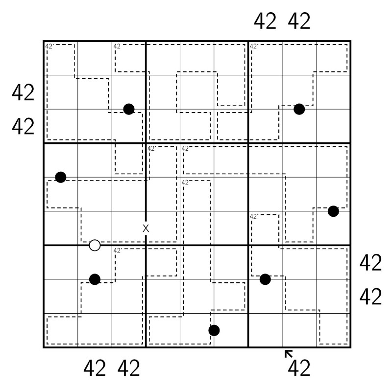 Zellen mit einem schwarzen Punkt zwischen ihnen enthalten Einträge, von denen einer genau doppelt so groß wie der andere ist. Zellen mit einem weiß ausgefüllten Punkt zwischen ihnen enthalten aufeinanderfolgende Ziffern. Zellen mit einem X zwischen ihnen haben Summe 10. Nicht alle diese Symbole sind notwendigerweise angegeben.