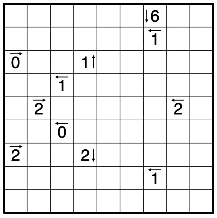 • Cells on loops have two types: "turn" if the loop turns 90 degrees, and "straight" if the loop passes straight through. Each number clue in the grid is visited by a loop, and the clue counts how many cells of the same type as itself are on the other loop in the indicated direction.