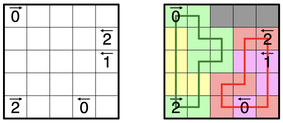 • Draw two loops that travel orthogonally through the centers of some cells. The loops do not intersect themselves or one another.