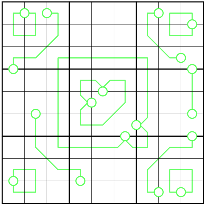 - Split Pea Lines: Digits on a green line between two circles must sum to a two-digit number formed by the values of the circles, in either order. If a line begins and ends at the same circle, the sum is the two digit number formed by repeating the value of the circle.
