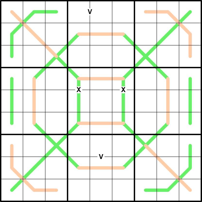 X/V: Digits in cells joined by an X sum to 10. Digits in cells joined by a V sum to 5. Not all Xs and Vs are given.