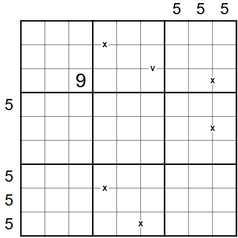 Die Zahlen außerhalb des Gitters sind entweder Sandwich-Summen, Hochhaus-Hinweise (Skyscraper) oder gleichzeitig beides. Im fertigen Gitter sind genau 5 der Außenhinweise gültige Hochhaus-Hinweise und genau 5 gültige Sandwich-Summen.
