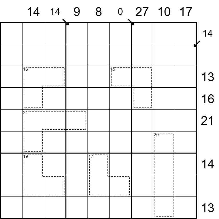 Sandwich: Numbers outside the grid indicate the sum of the digits located between the 1 and 9 in that row or column.