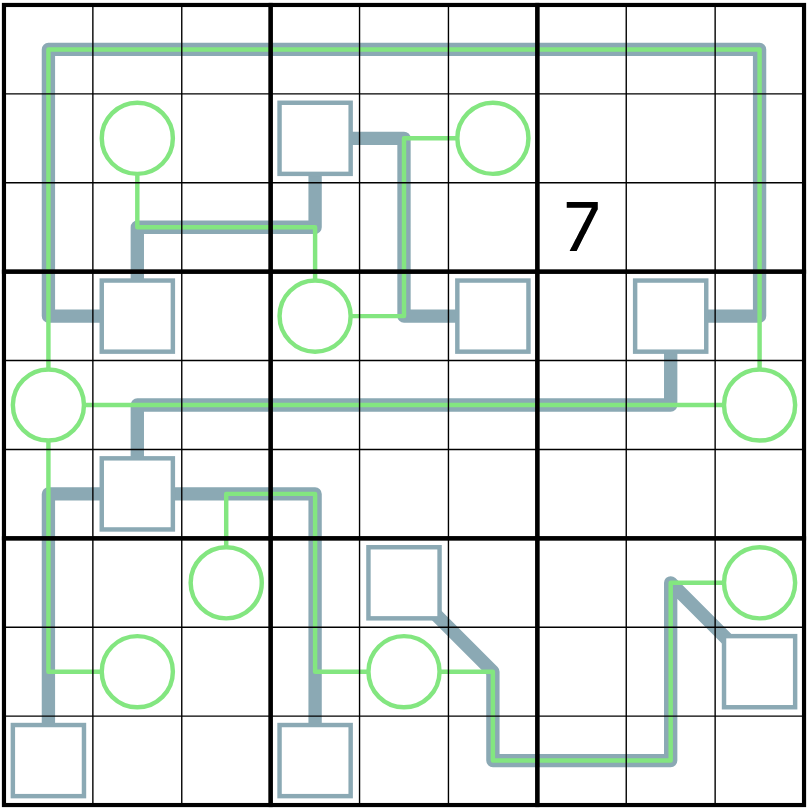 Product-Sum Lines: The sum of the digits on a line between two squares is equal to the product of the two digits in the squares.