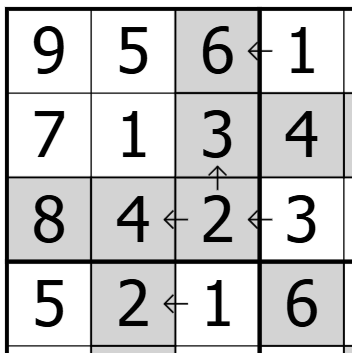 Arrows: Values in cells with arrows indicate the number of shaded cells in the given direction. All possible arrows are given! For example a valid box can look like this: