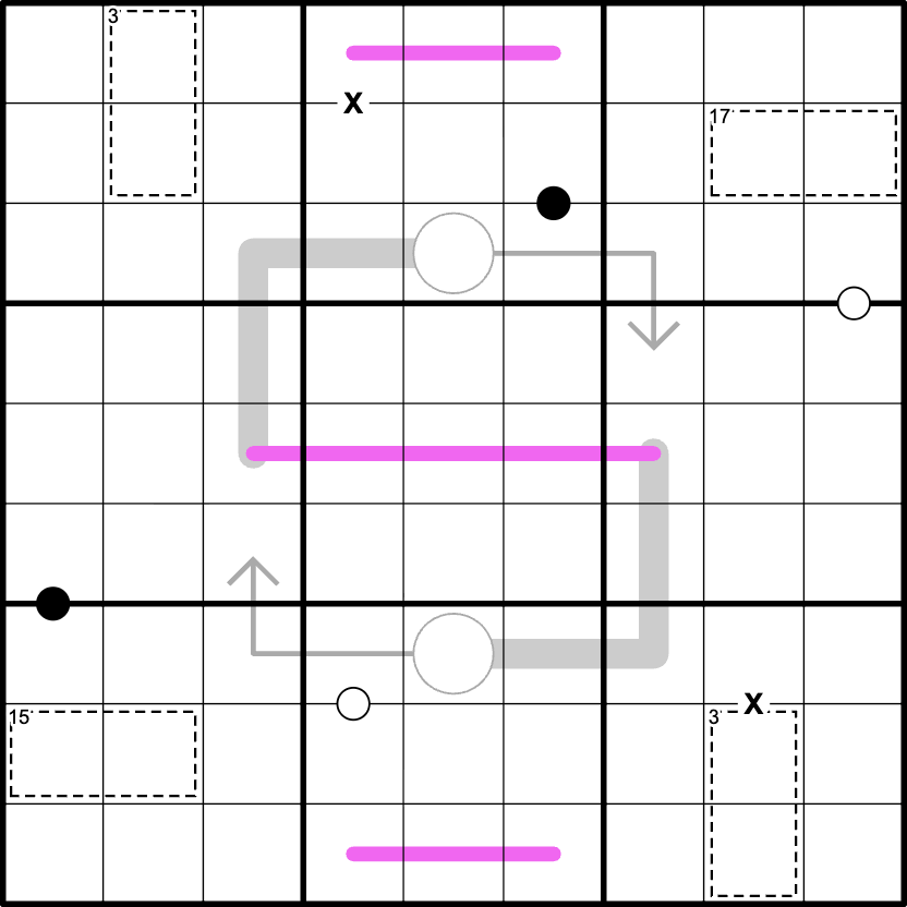 Renban-Linien: Die Ziffern entlang einer pinkfarbenen Linie bilden eine zusammenhängende, nicht wiederkehrende Gruppe in beliebiger Reihenfolge.