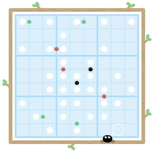 • A single silky thread must start at a white spot and connect to another white spot that is either one or two cells away in a straight line (horizontally, vertically or diagonally.) Any further and the thread will break!