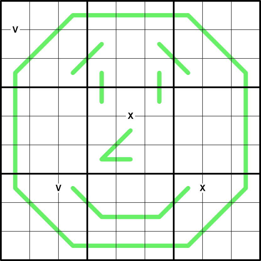 X/V: Digits in cells joined by an X sum to 10. Digits in cells joined by a V sum to 5. Not all Xs and Vs are given.