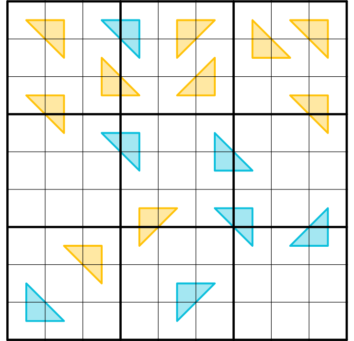 Triangles: Three digits connected by a triangle represent the side lengths of a valid triangle (i.e., the sum of any two sides is greater than the third). No two triangles in the grid have the same sum of their three digits. Every blue triangle has a greater sum than every orange triangle.