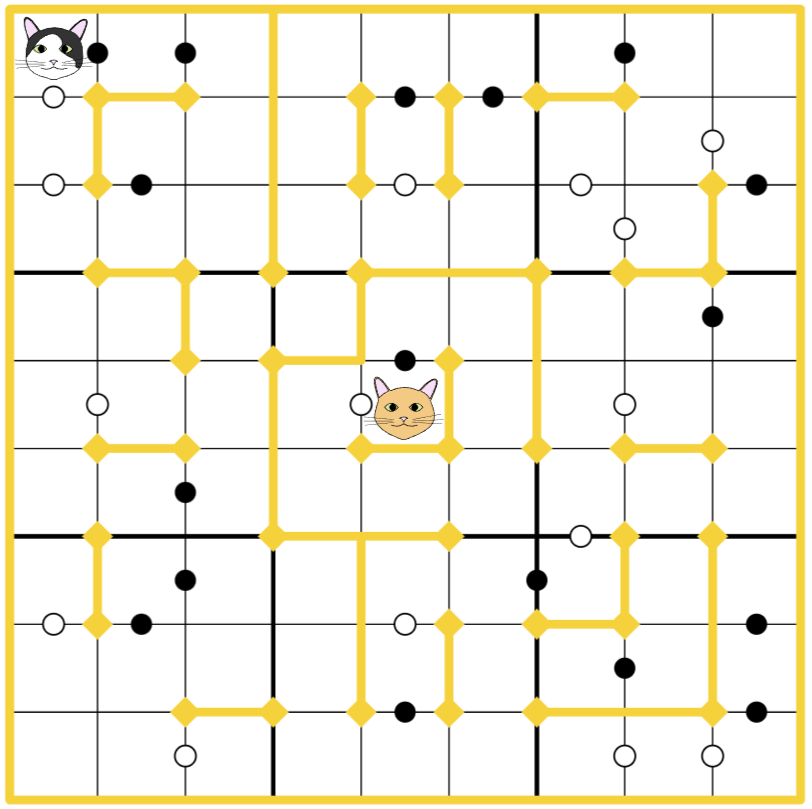 - Path Constraint: Any cell Poppy visits acts as a Copycat Cell. The value of a Copycat Cell is the digit in the cell rotationally opposite itself in the grid (180° rotation about the center of the grid). For example, if r2c3 is a Copycat Cell containing the digit 5, and r8c7 contains the digit 9, the value of r2c3 is the digit in r8c7, which is 9.