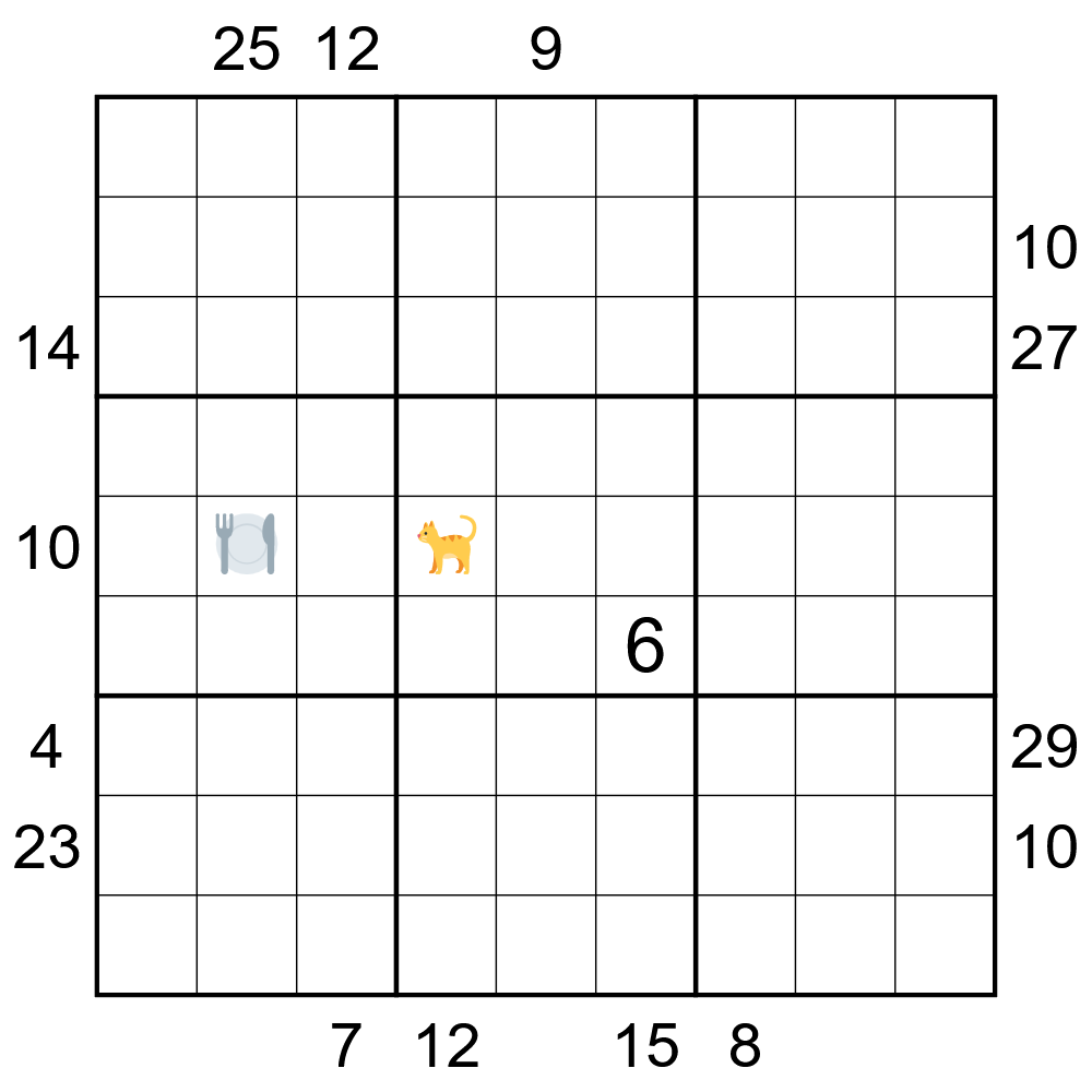 • A clue outside the grid is the sum of the values of the first X cells in the corresponding row/column, where X is the value of the cell nearest to the clue.