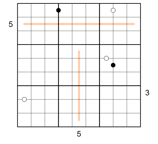 - Kropki Dots: A black dot between cells indicates cell values with a 2:1 ratio. A white dot between cells indicates cells with consecutive values. Not all dots are given.