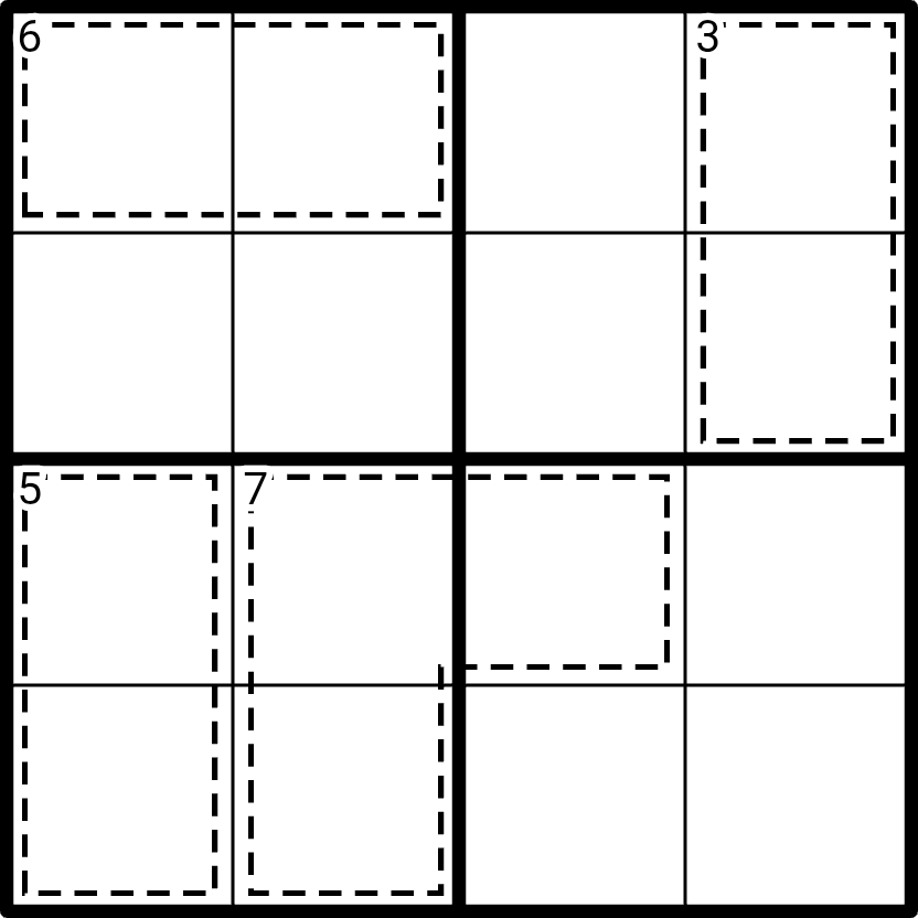 • Die gestrichelten Objekte nennt man Killer Käfige (keine Sorge, die bringen niemanden um und sind auch nicht mörderisch schwer). Die Ziffern in diesen Käfigen müssen sich zur angegebenen Zahl in der oberen, linken Ecke addieren. Ziffern wiederholen sich NICHT in Killer Käfigen.