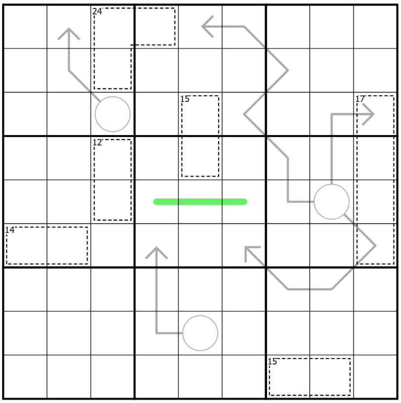 German whisper lines: Values of consecutive cells on the green line differ by at least 5.